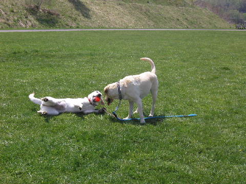 GWということもあり、メチャ混みでした。GW……後半より前半の方が空いているかと思って行ってみたんですが……はずれ〜皆考えることは同じなのか……シェリーが初めて初対面の子と引っ張りッコして遊びました。マールは相変わらずオモチャ、ボール命で……今日はちょっといい香りの女の子が来ていたらしく……何度もマウントしそうになり……オーナーの長崎さんに一喝されました。その後は二度としませんでした。
